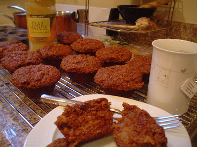 I made the muffins with the Trader Joe's pear halves (in a glass bottle), and used a cheese grater to mush them up. The only other tweaks I made (because I can't leave well enough alone) are to use 1/3 c molasses instead of 1/3 c of the honey, and to use a little more vanilla than called for (that's how my mom taught me to make baked goods taste better). I wish that I had used fresh pears like the recipe suggested (I was too lazy to go to the market and then wait for the pears to ripen), but that didn't stop me at all from eating a whole muffin when I was only planning to eat half. I will be happy to make these again, fresh pears or not. Holy crap, are these muffins good. The cake-y part tastes like a muffin, and not like a quick bread, which is great, and the whole grains make the texture interesting. The added moisture of the pears is divine, and the little bits of ginger are unexpected and give a whole other layer of warm flavor to the muffin. If I had a star rating system, these would get a billion stars.